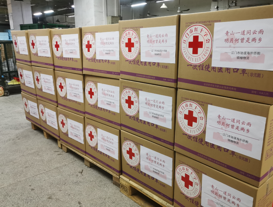 在江门抗疫的关键时刻,广大海外五邑籍华侨社团四处奔走联络,为家乡筹款募物,雪中送炭,全力支援家乡疫情防控工作。但近期随着海外新冠肺炎疫情不断蔓延,不少华侨遇到物资缺乏等困难。江门市时刻关注海外疫情防控形势、关心旅居海外的华侨华人。当获悉国外疫情防控形势趋紧时,为及时回应侨胞需求,市红十字会积极与相关部门和单位沟通,协助研究和制定新冠肺炎疫情防控期间向海外捐赠防疫物资的相关工作方案,并计划向其他部分国家(地区)的多个五邑籍侨团和友好城市进行捐赠。