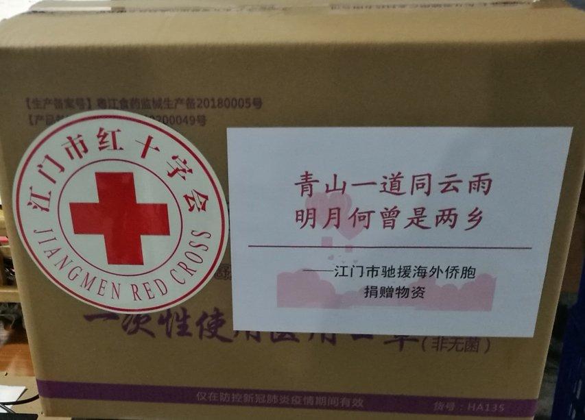 “青山一道同云雨,明月何曾是两乡”,每批捐赠物资的外包装上,都贴有唐朝诗人王昌龄的这句诗词,以此表达家乡与海外侨胞情同一心、携手抗疫的深情厚谊。疫情面前,我们与侨胞是命运共同体,全世界也是一个命运共同体。江门市红十字会再次呼吁大家齐心协力,共同战‘疫’。