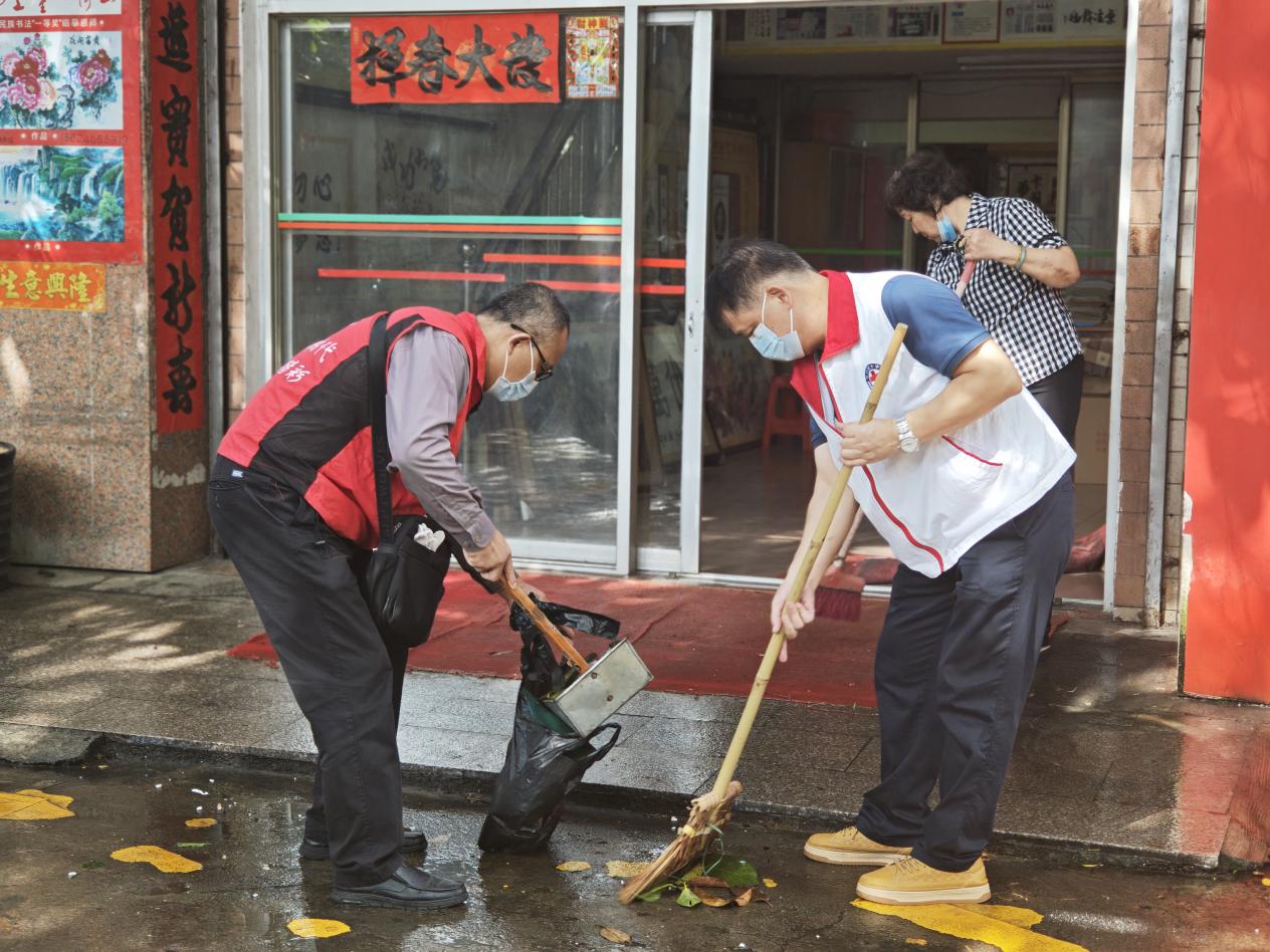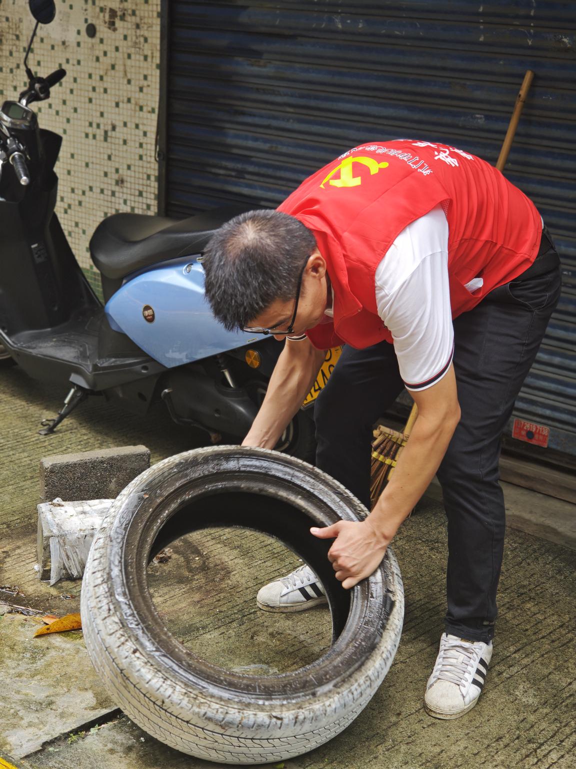 9月25日“桦加沙”台风过后,在良化西社区,党员干部根据社区的需求和安排,深入小区街道、背街小巷、居民小区、城市公园等蚊虫孳生重点区域,与环卫工人、群众居民一道开展“地毯式” 环境清理。大家手持扫帚、垃圾铲等工具,认真清扫垃圾杂物、疏通排水管道、清理积水隐患、翻倒盆罐、轮胎等清除积水,从源头上减少蚊虫滋生环境。