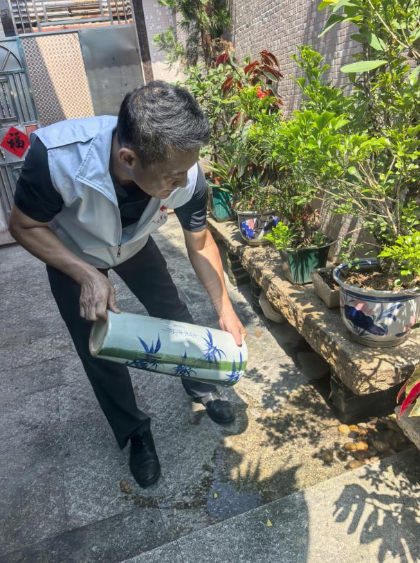 蓬江区红十字志愿服务队下沉一线,包村联户,与农村、社区“两委”干部联合作战,全力以赴打赢疫情歼灭战。通过串小巷、进家庭,向居民派发防控宣传单,协助居民检查住所周边的花盆托盘、水桶、水缸等容器,进行翻盆倒罐,面对面讲解基孔肯雅热的传播途径、症状及预防方法,提醒居民做好日常防蚊措施,保持环境整洁,做好个人防护。