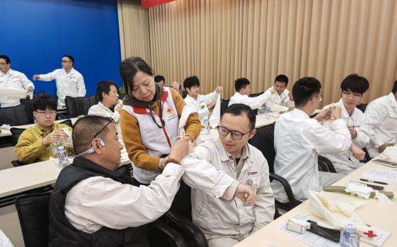 此次参加培训的员工涉及生产运行一线、燃料系统管理、检修维护等多部门多工种。为更好地切合贴近工作实际需求,培训老师量身定制培训内容,重点讲授创伤止血包扎、骨折固定、伤员转运、中暑与烧烫伤处置等实用急救技能。课程结合设备操作、物料搬运等典型生产场景,组织开展情景模拟演练,并围绕设备检修过程中可能出现的复合型伤害,强化高空坠落、触电急救等专项内容学习,提升员工在复杂事故中的综合处置能力。