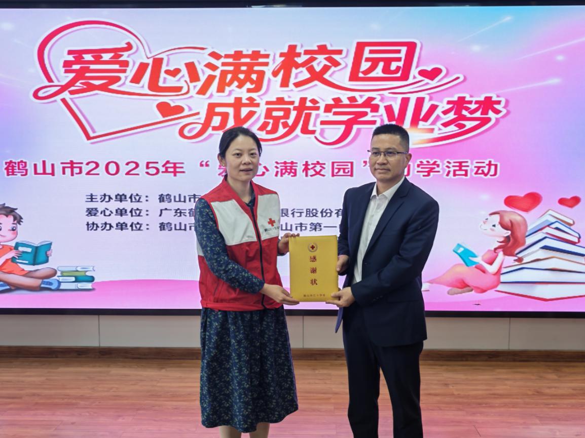 鹤山市红十字会向鹤山农商银行颁发感谢状,向鹤山市教育局移交助学金爱心牌,推动善款精准落地。据了解,2025年该活动共筹集善款22万元,其中10万元来自鹤山农商银行捐助,12万元源于社会捐赠及“红十字爱心储蓄罐”学生爱心捐款,将定向资助鹤山市167名困境学子。
