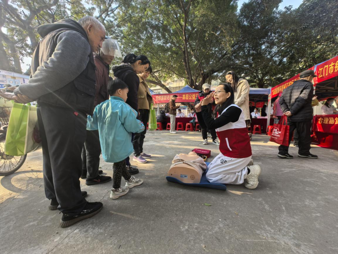 为增强宣传实效,蓬江区红十字会志愿者还进行了现场实操演示,完整展示心肺复苏(CPR)的标准流程与AED的规范操作步骤,针对操作中的易错点、注意事项逐一讲解,手把手引导群众加深理解,切实提升大家应对突发情况的自救互救能力。