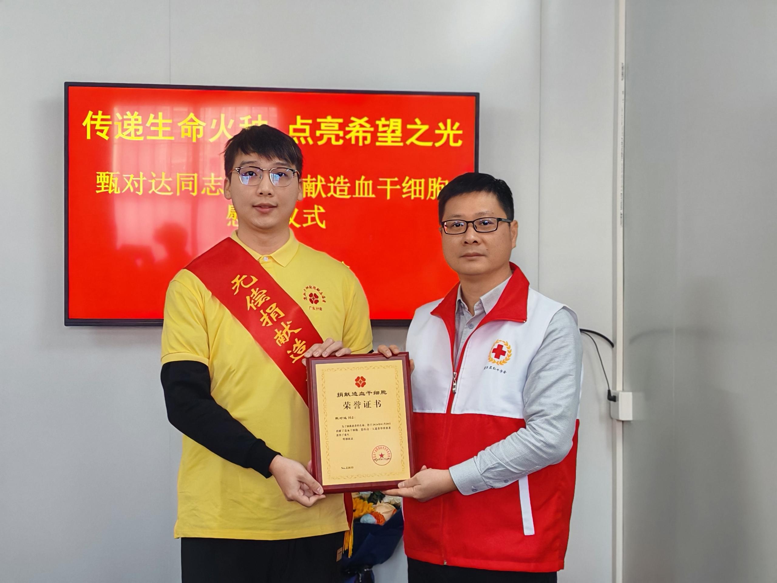 这两次的捐献,让谌张烨和甄对达分别成为蓬江区第13例、江门市第54例造血干细胞非亲缘捐献者和蓬江区第14例、江门市第55例造血干细胞非亲缘捐献者。
