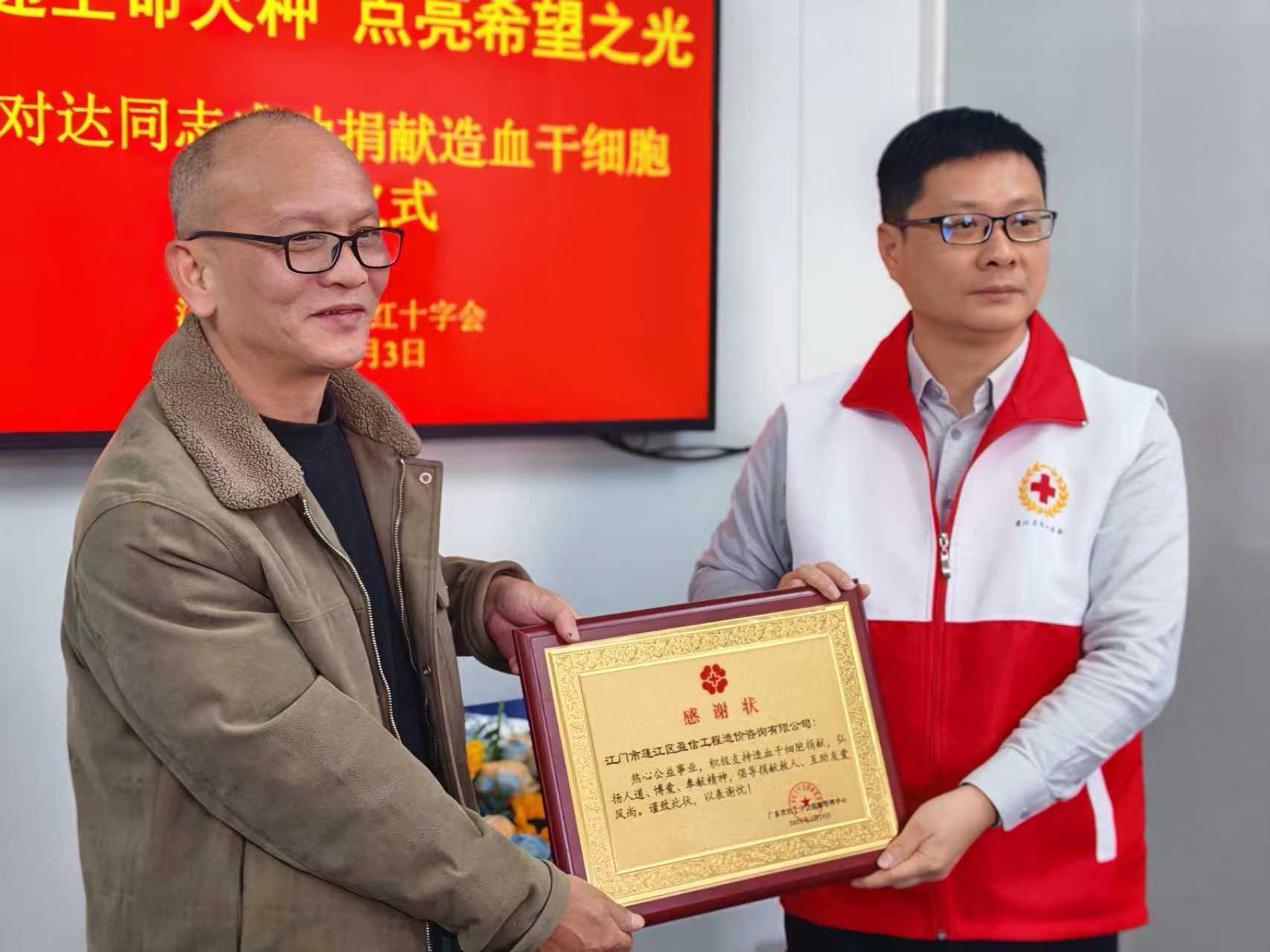 为弘扬无私奉献、拯救生命的大爱精神,2月3日,蓬江区副区长利锦波率队走访慰问江门市蓬江区盈信工程造价咨询有限公司。座谈会上,利锦波副区长对甄对达见义勇为、捐献救人的善举给予充分肯定,甄对达现场分享了捐献过程中的切身感受。其所在单位领导对他的行为表达了高度赞赏。随后,利锦波副区长向甄对达颁发荣誉证书,并向其所在单位颁发感谢状,以表彰这份为生命接力的可贵奉献。