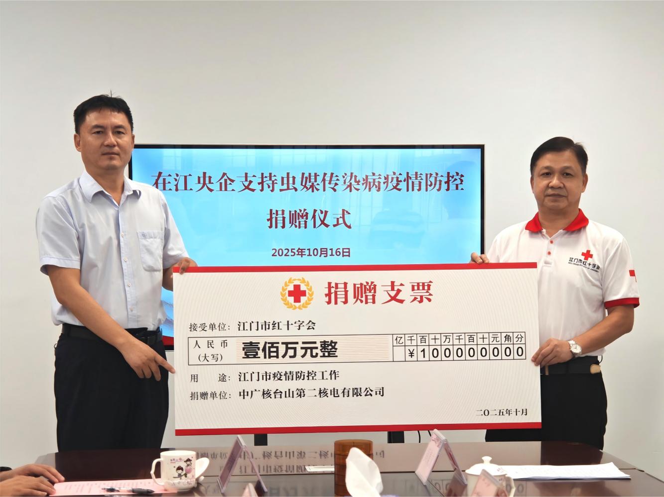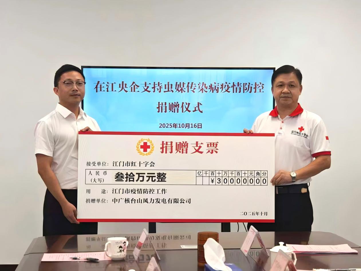 捐赠仪式在庄重而温馨的氛围中进行。中广核台山风力发电有限公司、中广核台山第二核电有限公司、国能粤电台山发电有限公司依次向江门市红十字会移交了象征支持与爱心的捐赠支票。市红十字会党组书记、常务副会长黄集文代表市红十字会接收捐赠。