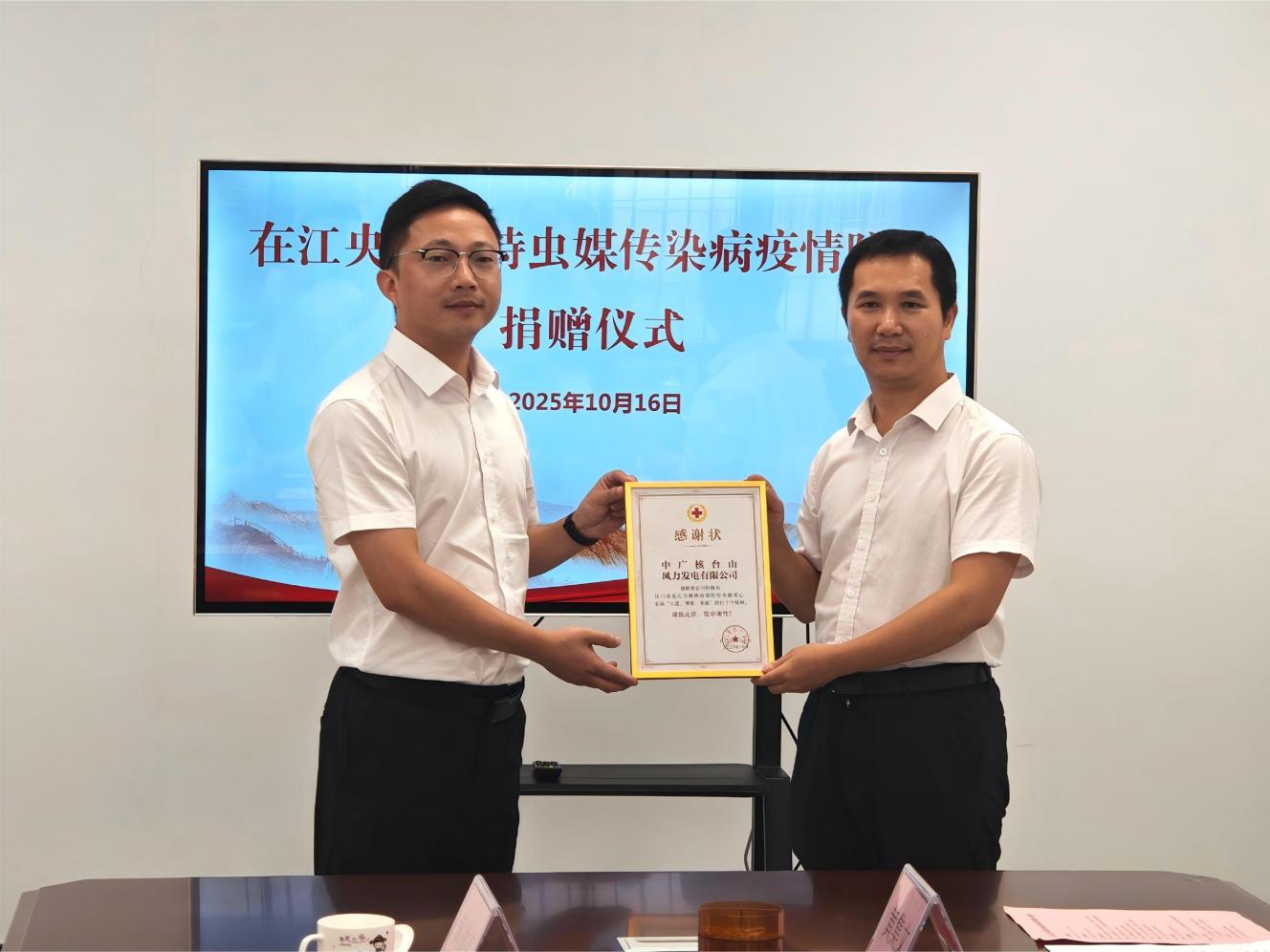 市政府副秘书长、疫情防控指挥办副主任岑明俸,市发改局党组书记、局长、市虫媒传染病疫情防控物资保障组组长胡其波,市发改局党组成员、副局长罗志勇,市红十字会党组书记、常务副会长黄集文,副会长兼秘书长邓燕群,以及国能粤电台山发电有限公司、中广核台山第二核电有限公司、中广核台山风力发电有限公司的企业代表共同参加仪式。