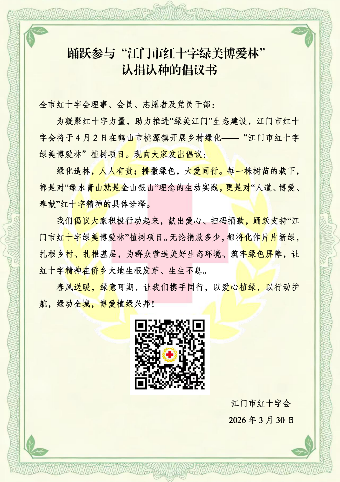 在活动开展前期,市红十字会发出《踊跃参与江门市红十字博爱林认捐认种的倡议书》,理事、会员、志愿者们纷纷献出爱心、扫码捐款,并踊跃报名参与“江门市红十字博爱林”植种活动。