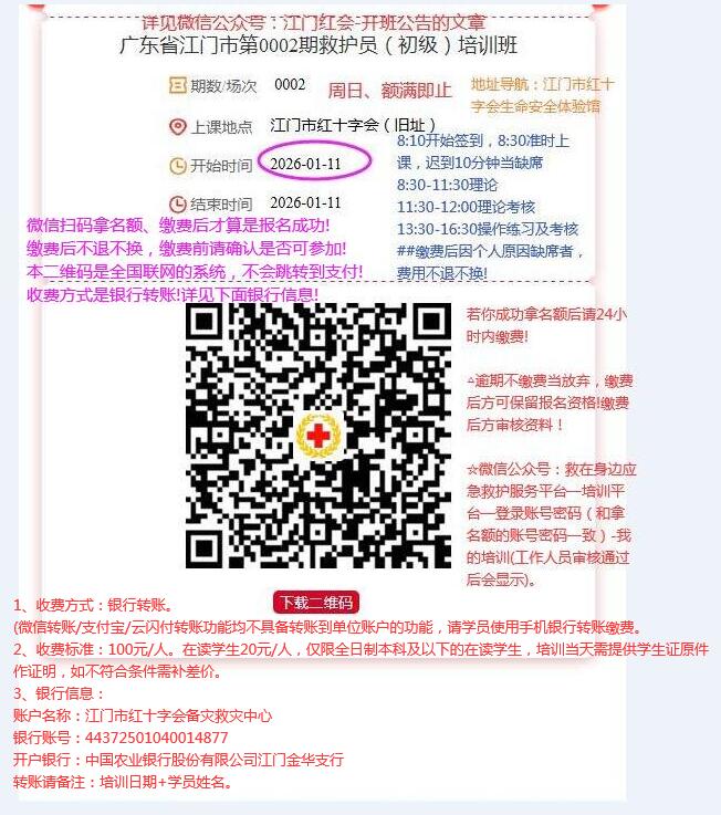 三、培训地点(旧址):江门市蓬江区象山新村122号二层江门市红十字会(建议先到江门市农林小学,农林小学正门斜对面的美华景家具,进巷即可见)或导航:江门市红十字会生命安全体验馆(同一位置)。小车停车位较紧张,请预留充足时间停车,建议尽量采用摩托车前往。