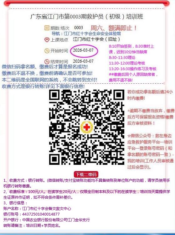 三、培训地点(旧址):江门市蓬江区象山新村122号二层江门市红十字会(建议先到江门市农林小学,农林小学正门斜对面的美华景家具,进巷即可见)或导航:江门市红十字会生命安全体验馆(同一位置)。小车停车位较紧张,请预留充足时间停车,建议尽量采用摩托车前往。