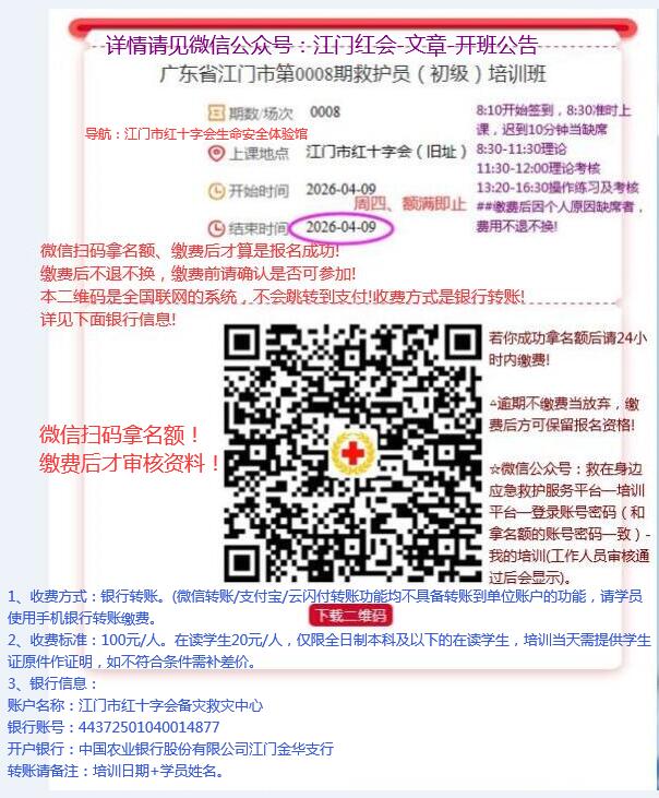 三、培训地点(旧址):江门市蓬江区象山新村122号二层江门市红十字会(建议先到江门市农林小学,农林小学正门斜对面的美华景家具,进巷即可见)或导航:江门市红十字会生命安全体验馆(同一位置)。小车停车位较紧张,请预留充足时间停车,建议尽量采用摩托车前往。