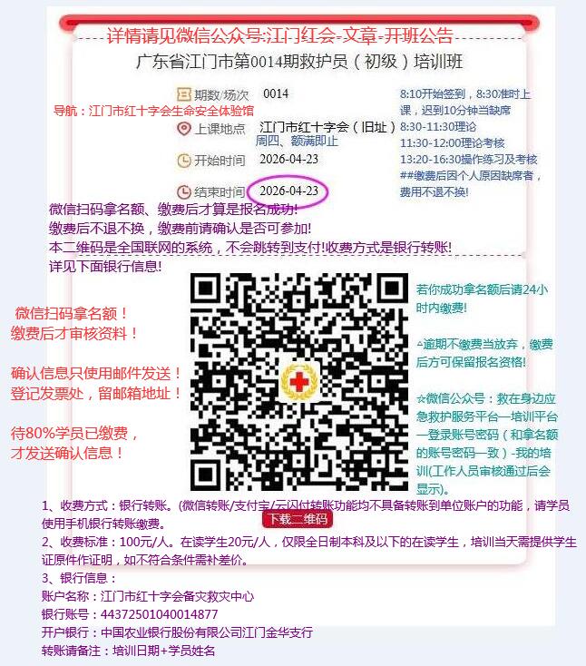 三、培训地点(旧址):江门市蓬江区象山新村122号二层江门市红十字会(建议先到江门市农林小学,农林小学正门斜对面的美华景家具,进巷即可见)或导航:江门市红十字会生命安全体验馆(同一位置)。小车停车位较紧张,请预留充足时间停车,建议尽量采用摩托车前往。