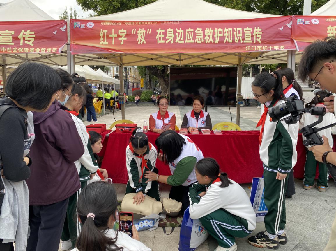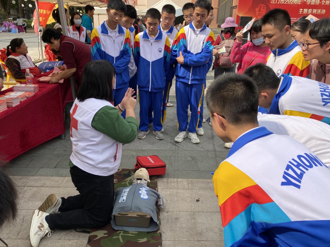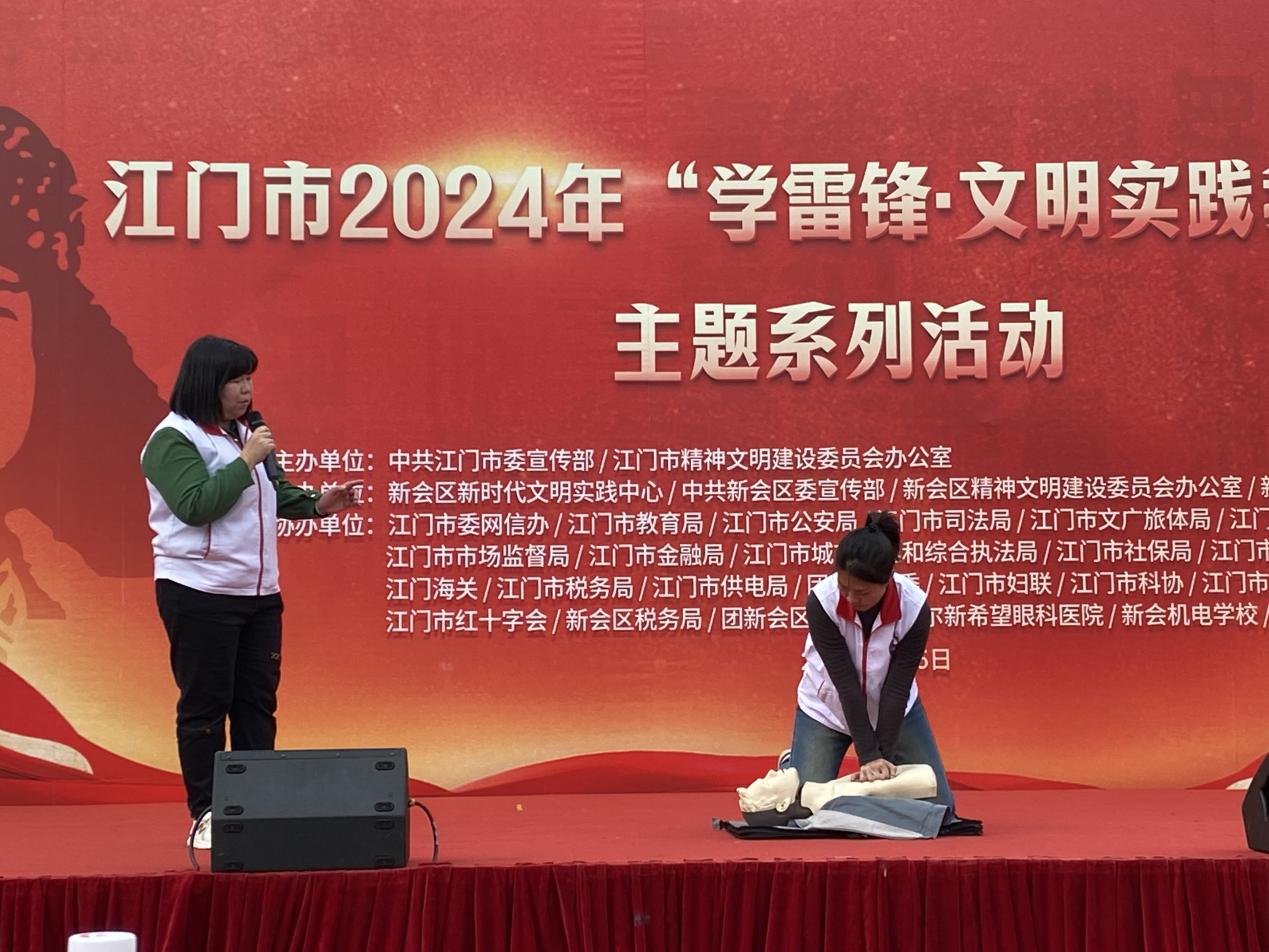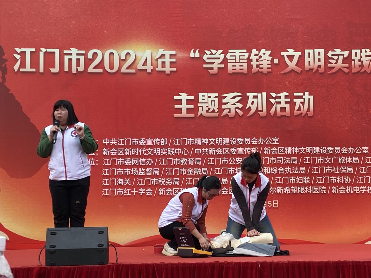 今年3月5日是第61个学雷锋纪念日和第25个中国青年志愿者服务日。为大力弘扬传承雷锋精神,培育文明新风,提高市民群众的救护知识素养。3月5日下午,市红十字会选派红十字应急救护志愿服务队参加在新会区人民会堂前广场举办的“学雷锋,文明实践我行动”主题系列活动,活动由市委宣传部、文明办等单位牵头举办。活动现场,红十字应急救护师资源老师走上舞台,边向群众演示心肺复苏术和AED(自动体外除颤)使用,边详细讲解有关操作要点。