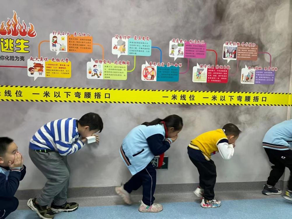 小学员们弯着腰、排好队沿着墙壁现场模拟火灾逃生。