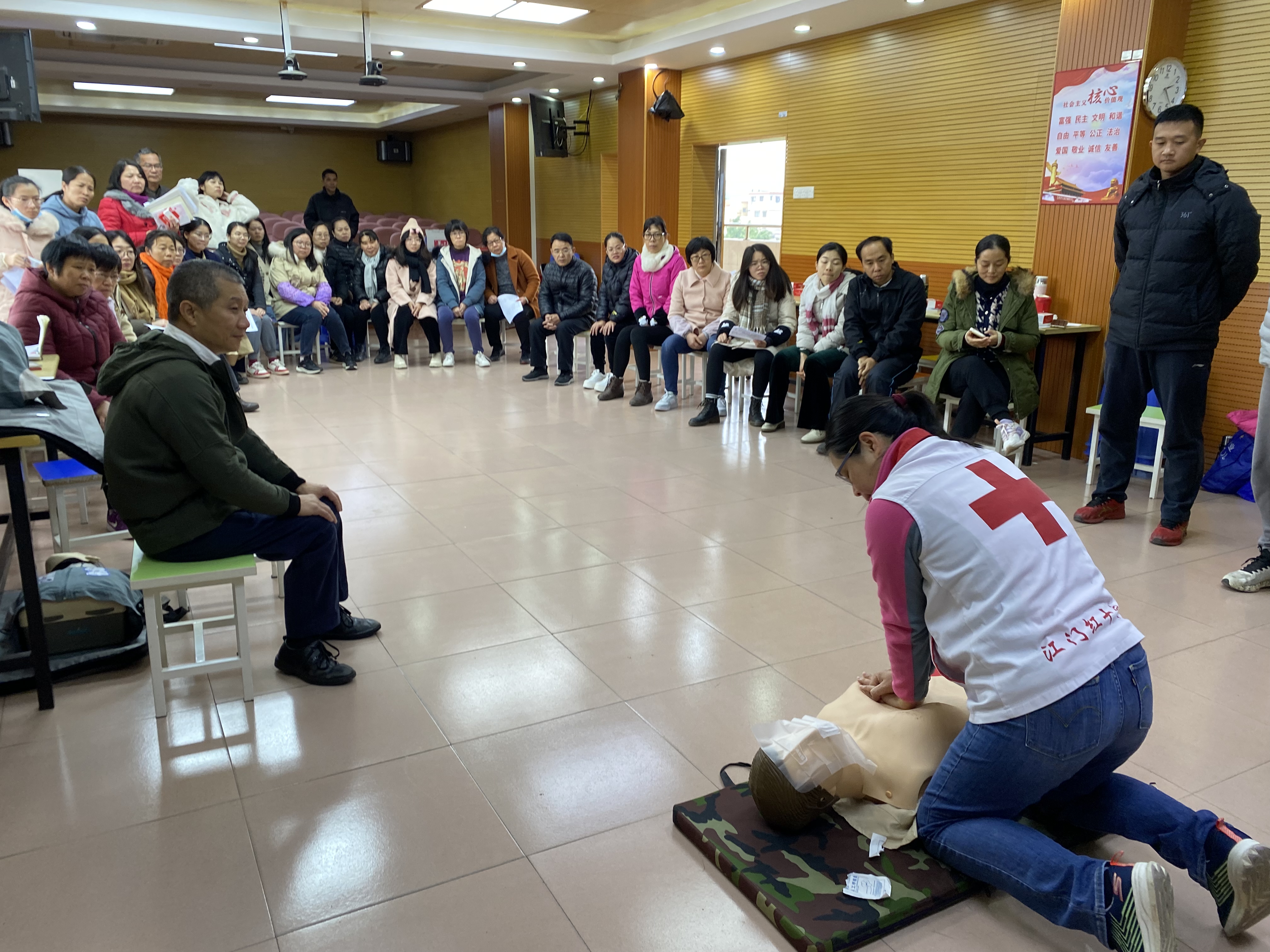 其中,12月26日培训活动在杜阮镇龙榜小学开讲,红十字应急救护师资源志英为大家授课。课堂上,源老师首先介绍了红十字运动的起源、红十字精神及红十字会职能等基本知识。接着,围绕红十字应急救护知识与技能,采用理论讲解和操作演示相结合的教学形式,详细讲解了心肺复苏术操作、自动体外除颤器使用、气道异物堵塞急救以及创伤现场急救的止血、包扎、固定和搬运四项基本技术,并进行了现场的操作演示,使参加培训人员更加直观地掌握现场急救的基本技能。