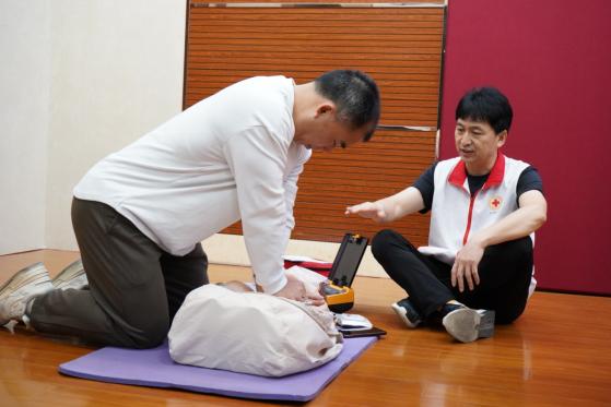 “1001,1002,1003,......1008,患者没有呼吸,没有心跳,立即进行心肺复苏!”培训现场气氛活跃,干部职工们认真参与实操练习,师资们从评估施救环境、判断患者有无意识、胸外按压部位、按压深度、按压频率等方面逐一指导,力求学员将心肺复苏+AED的动作和操作流程、动作做到位。