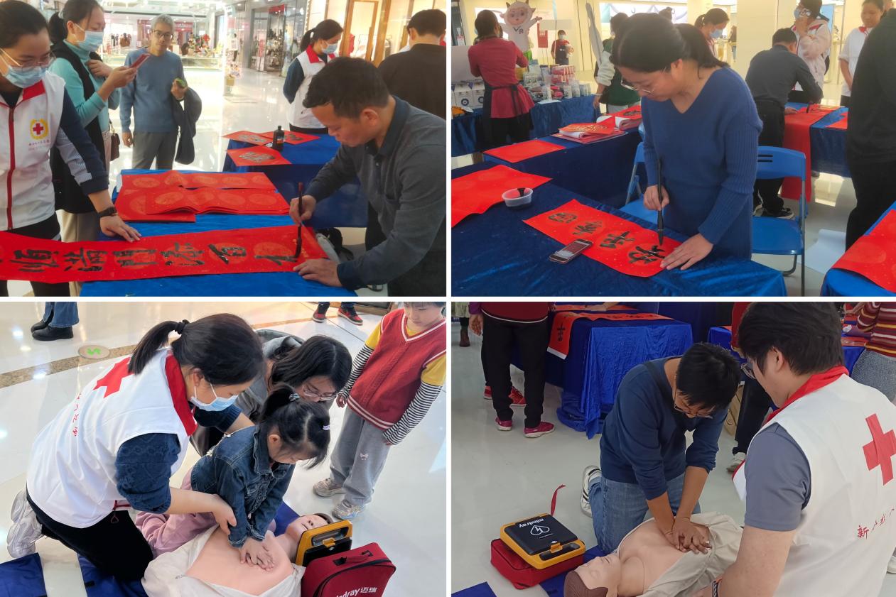 在活动舞台旁边分别还设置了书法家挥春送春联摊位和普及应急救护知识摊位,现场活动节目丰富,氛围积极活跃,吸引众多群众前来参与。